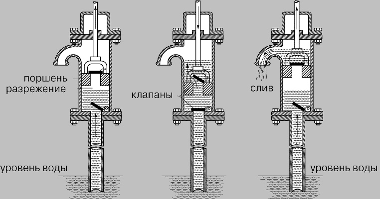 Внутри находится поршень с клапаном и с обратным клапан. При возвратном движении вода всасывается в корпус цилиндра, при поступательном перемещении поршня обратные клапаны закрываются и вода выталкивается наружу.
